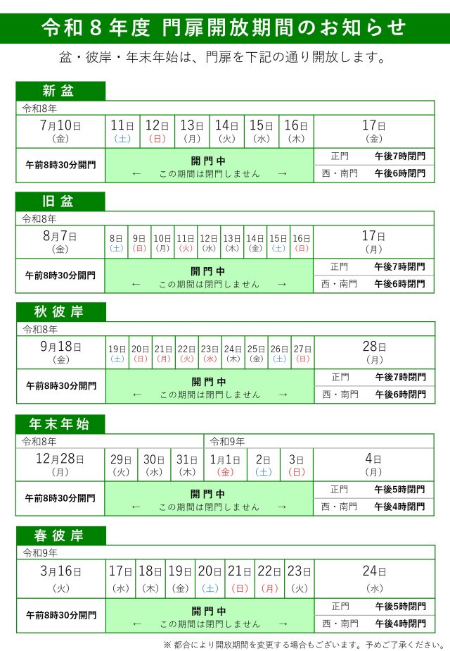 令和8年度 門扉開放期間のお知らせ(盆・彼岸・年末年始)