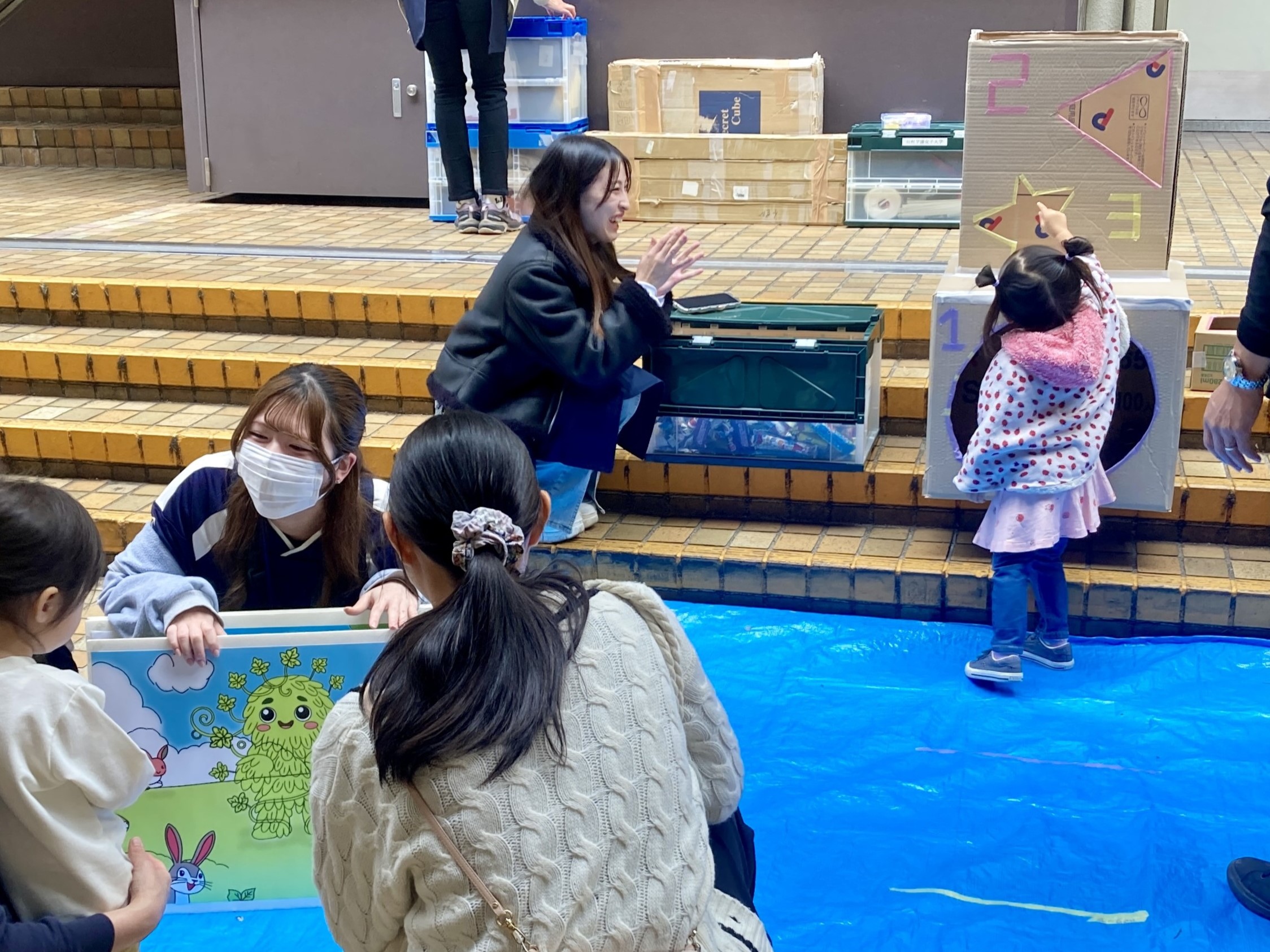また、人間の活動により葛が海外へ持ち出されたことをきっかけに侵略的外来種となってしまったことや、国内において里山の保全が衰退し、葛が増えてしまったことを紙芝居で解説します。紙芝居やストラックアウトの的やボールなどは、川村学園女子大学の学生の皆さんの手作り!当日も西武造園のスタッフと一緒にブースでプログラム対応をしてくださいました。