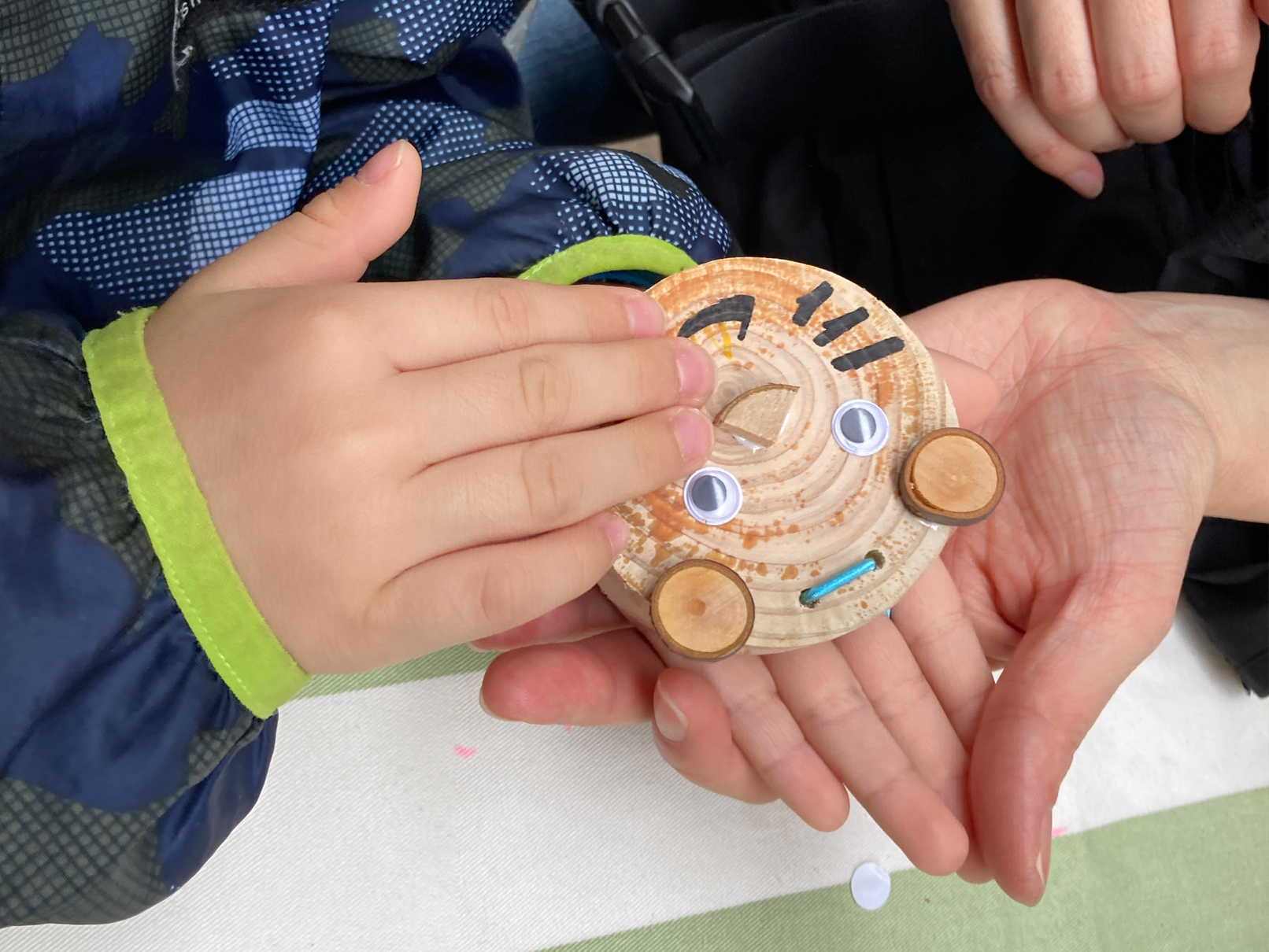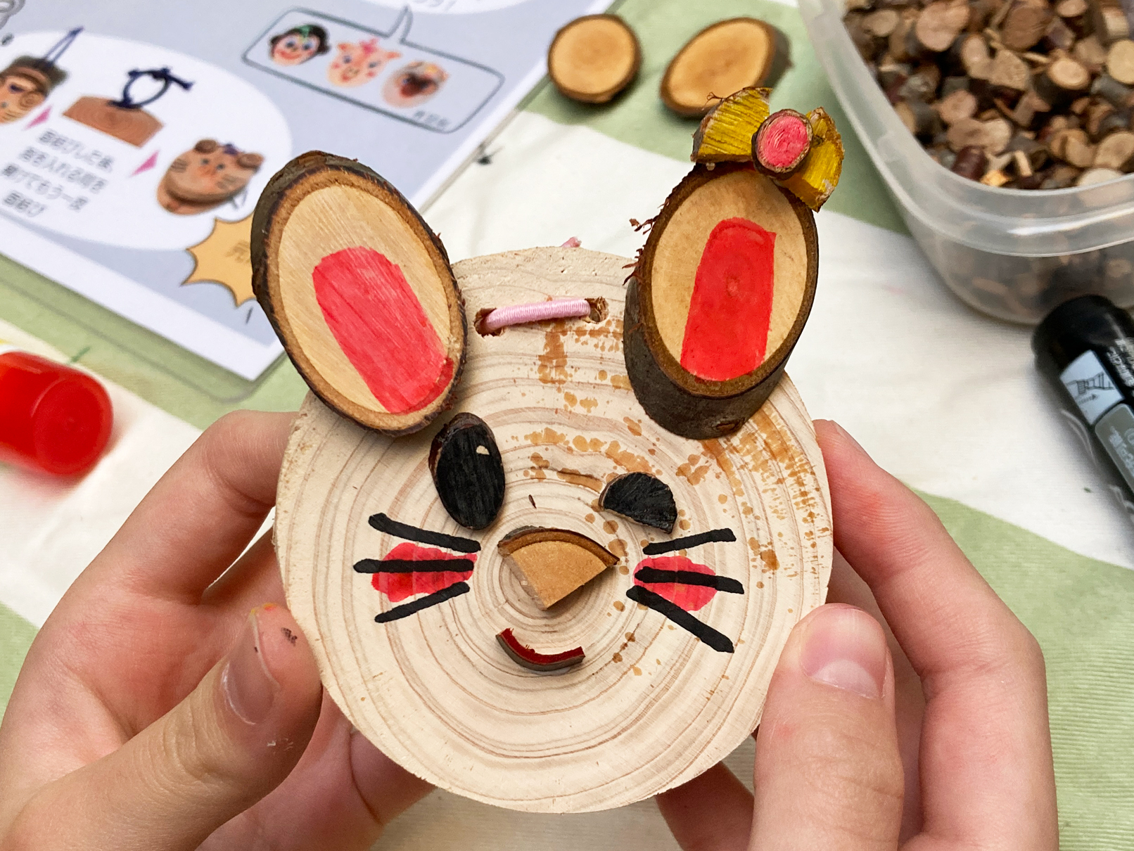 『間伐材カスタネットづくり』では、森林管理で発生した“間伐材”や“木の実”など素材を使い、動物の顔をモチーフにした自分だけのオリジナルカスタネットを作っていただきました。