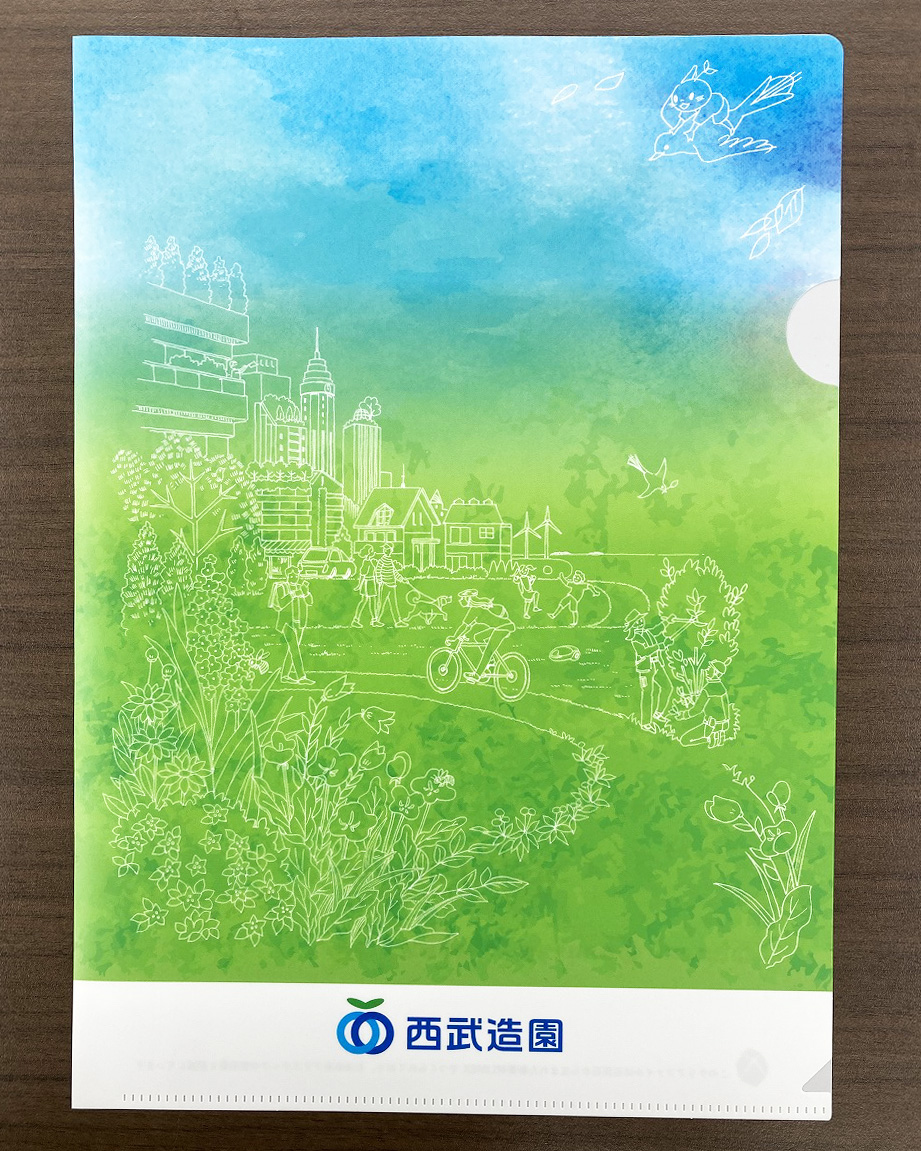 2016年に作ったデザインで、爽やかなブルーに、私たち西武造園グループが関わる「みどり空間のある街並み」を描いています。