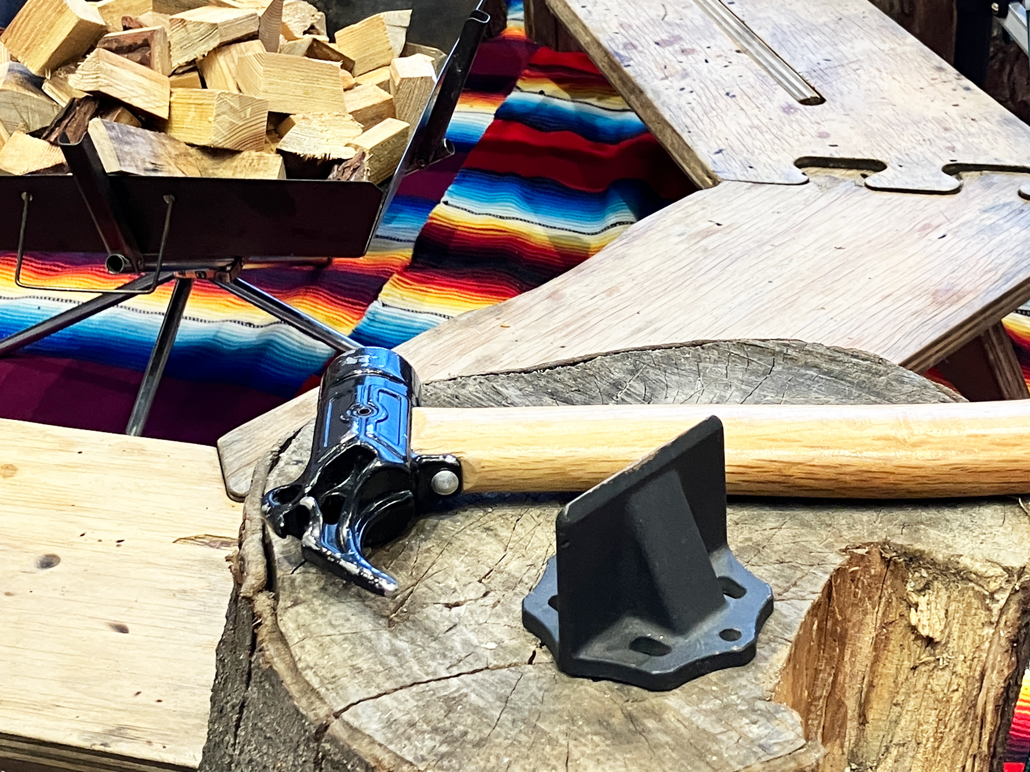 「ミニ薪束キーホルダー作り体験」では、小さな薪割り器材を使って、本物の薪材を切ってもらいます。