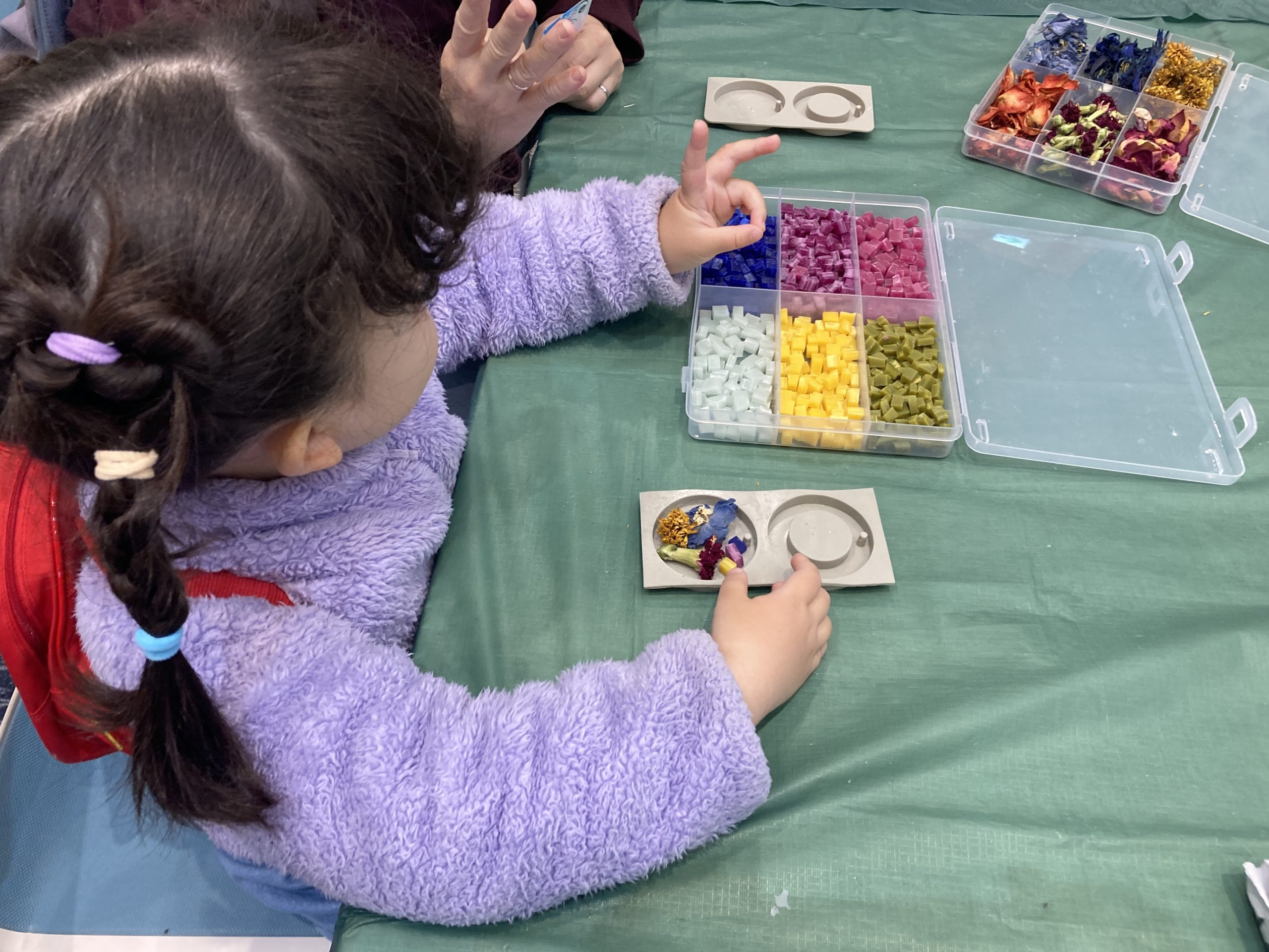 廃棄予定だった生花をドライフラワーにして、アロマの香りづけをしたワックスに飾り付けていきます。小さなお子さまでも体験しやすく、植物に触れたり、香りを感じることができるワークショップで、五感をつかって楽しんでいただきました。