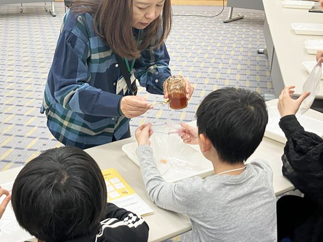 会場内には、さまざまな養蜂関係団体のブースが出展されており、学生の方も多く訪れていました。西武造園のブースでは、「はち育®」に関する取り組みを紹介するパネル展示や、みつばちに関するクイズなどを実施したほか、23日(日)には「はちみつでバスボム作り」のワークショップも行いました。