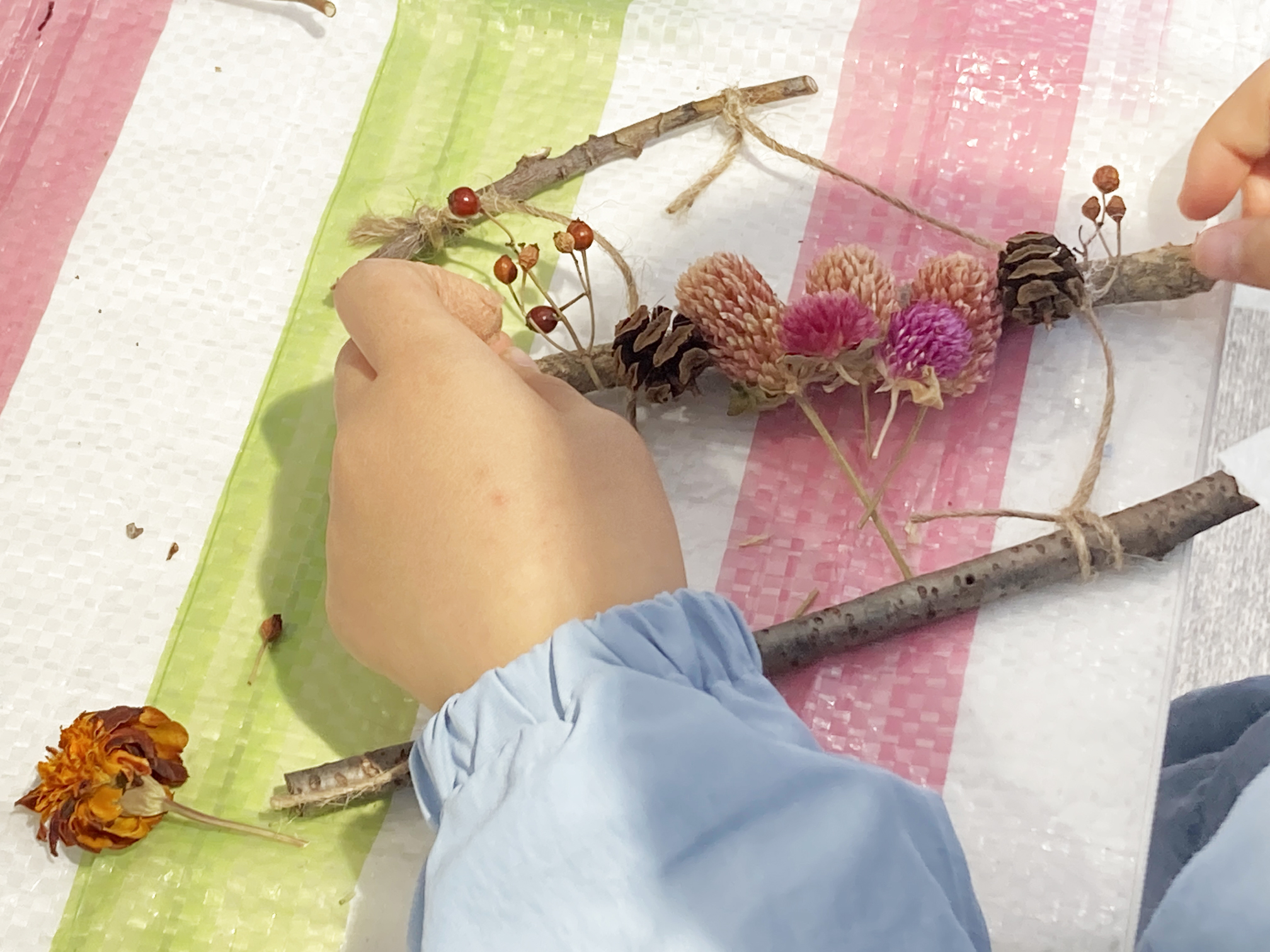 皆さん一つ一つ形の違う枝や実を手に取り、思い思いの作品作りを楽しんでいただきました。