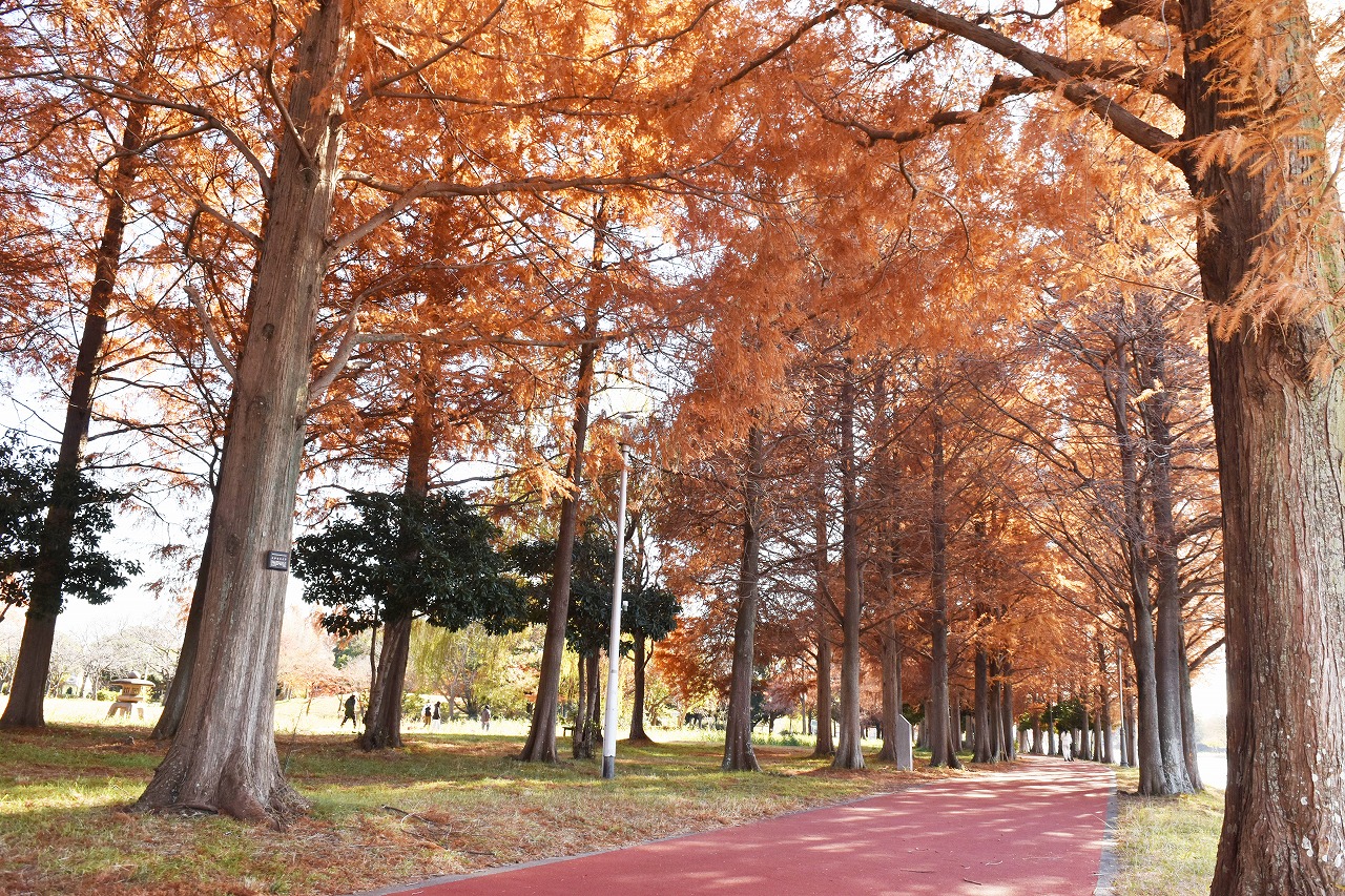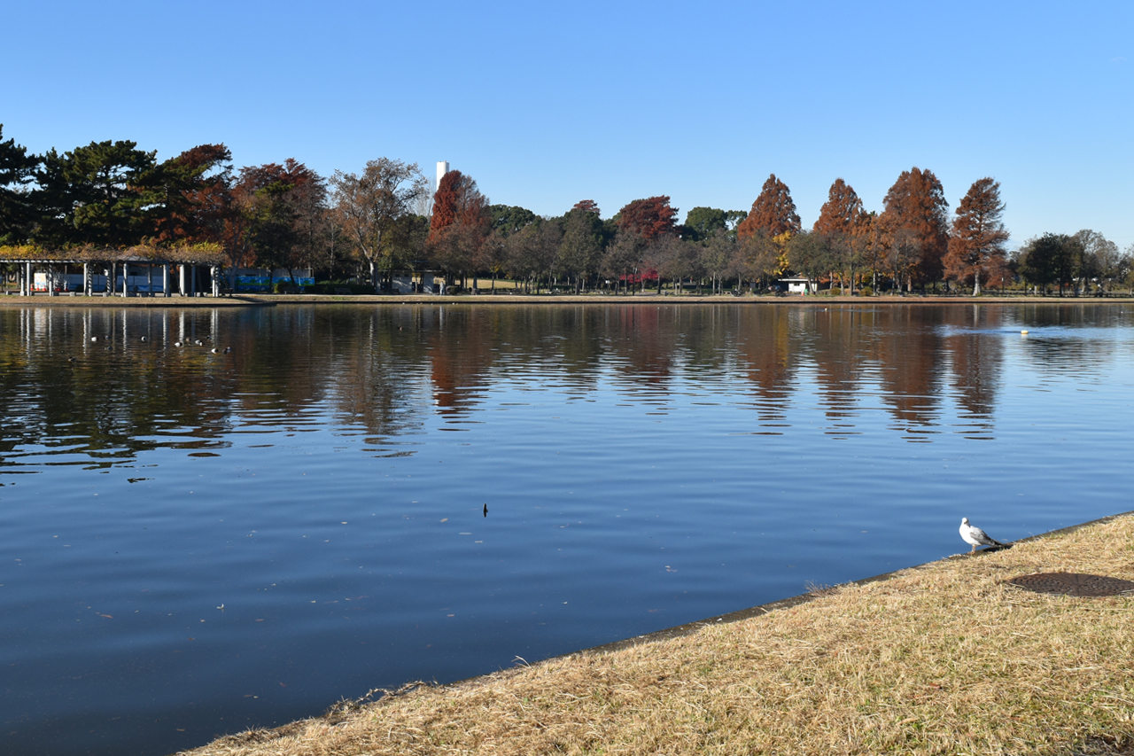 埼玉県営みさと公園は、江戸川と中川に挟まれた「小合溜井(こあいだめい)」に沿って広がる水辺の緑の公園で、この季節は特に水辺に映る木々の鮮やかな景色がみどころです。