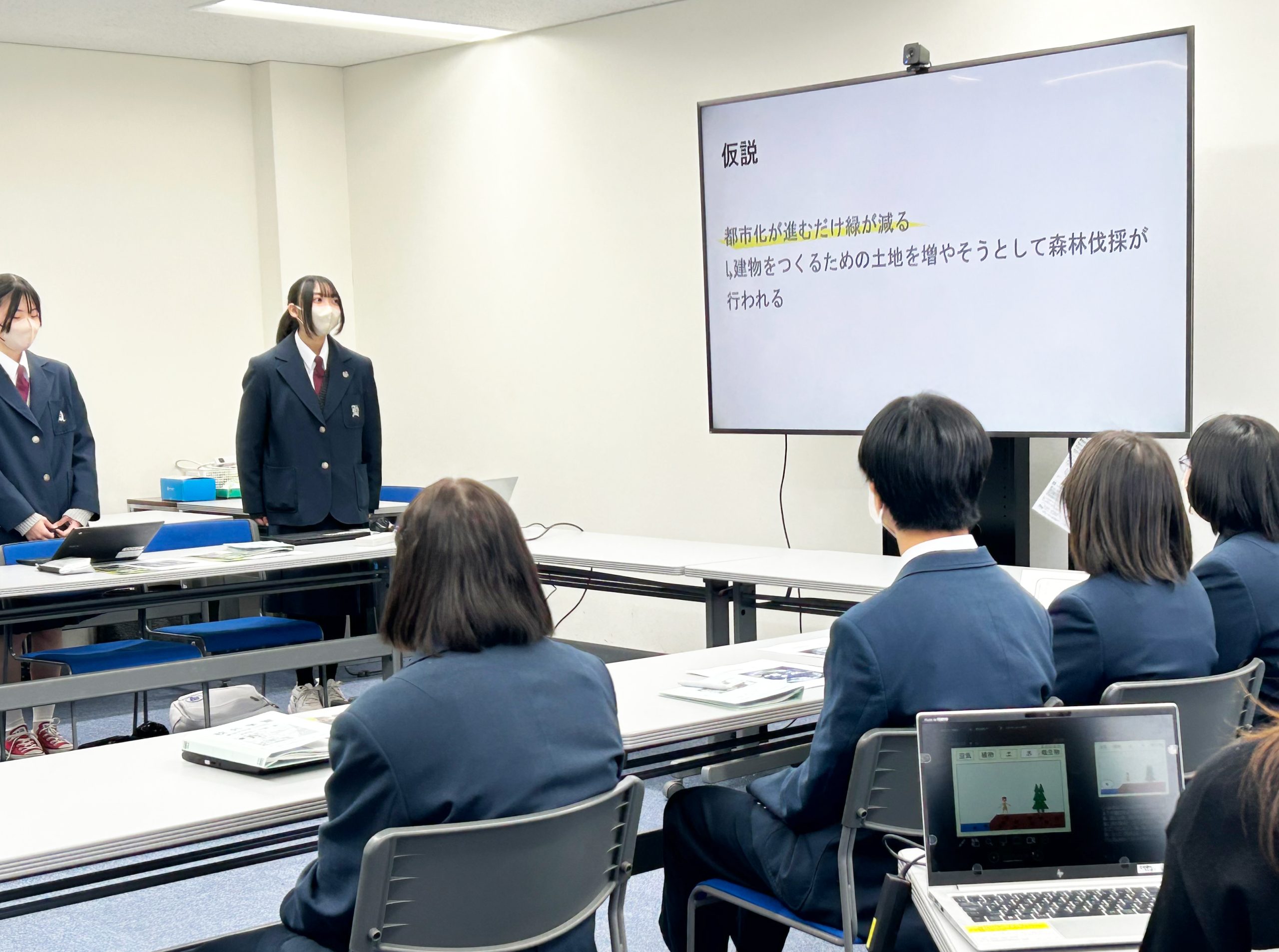 SDGsの17つの目標のうち「15 陸の豊かさも守ろう」に関連する探求テーマを設定し、その問題解決策を提案するというものです。生徒の皆さんは、都市化が進むなかで「みどり」が減少していく現状に関心を抱き、次の2つのテーマについて調査したことを発表してくれました。