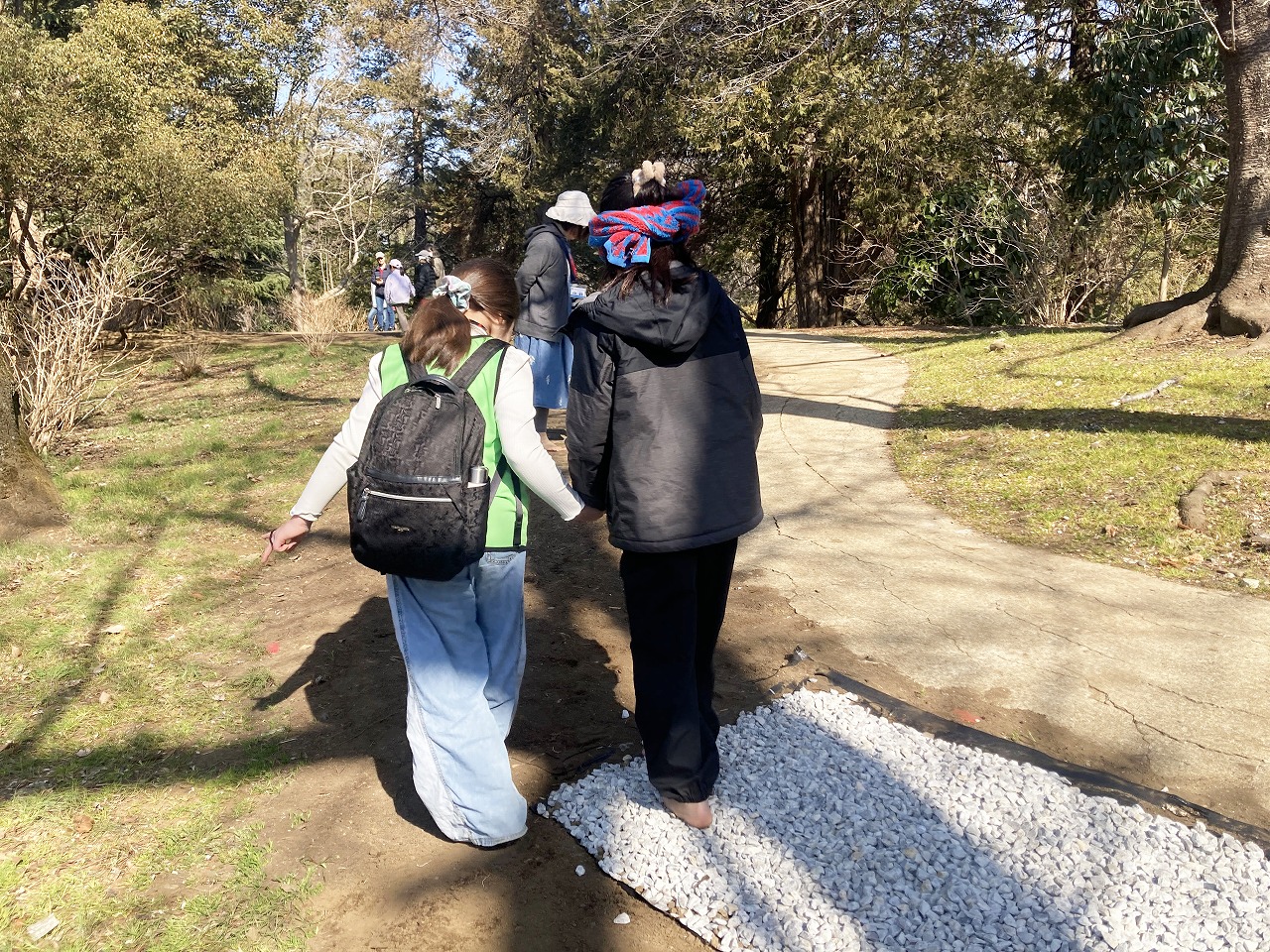 寒さを心配していましたが、当日は予想を超えて気温が上がり、4月並みの暖かさに。汗ばむほどの日差しを浴びて、土の感触や草の温もり、木々のざわめきなど、全身で感じていただきます。視覚以外の感覚を研ぎ澄ますことで、さまざまな気付きを得ることができるのです。