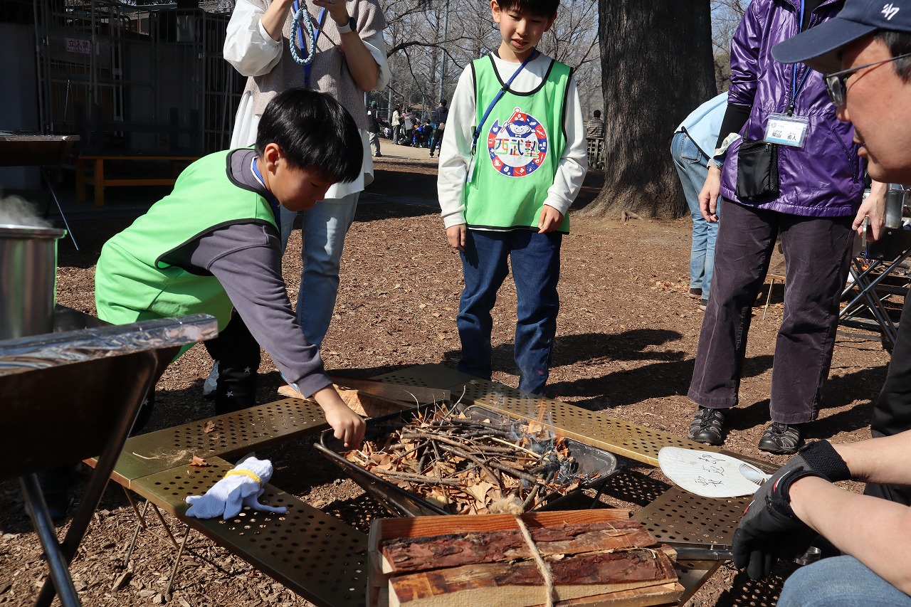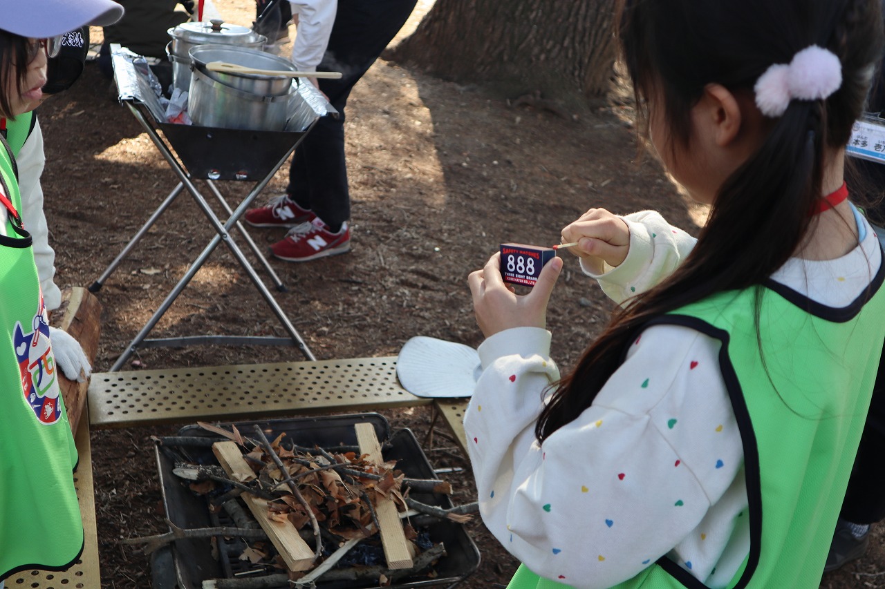 初めて焚火に火をつける子も多く、皆さんスタッフに教わった方法で一生懸命チャレンジしていました。無事に火が付くと「やったー!」と喜びの声も。この「西武塾」では、新たなことに挑戦して、子どもたち自身の達成感や感動につなげていくことも大切にしています。周りで見守っているスタッフも、火起こしが成功した様子をみて、とても嬉しく感じました。