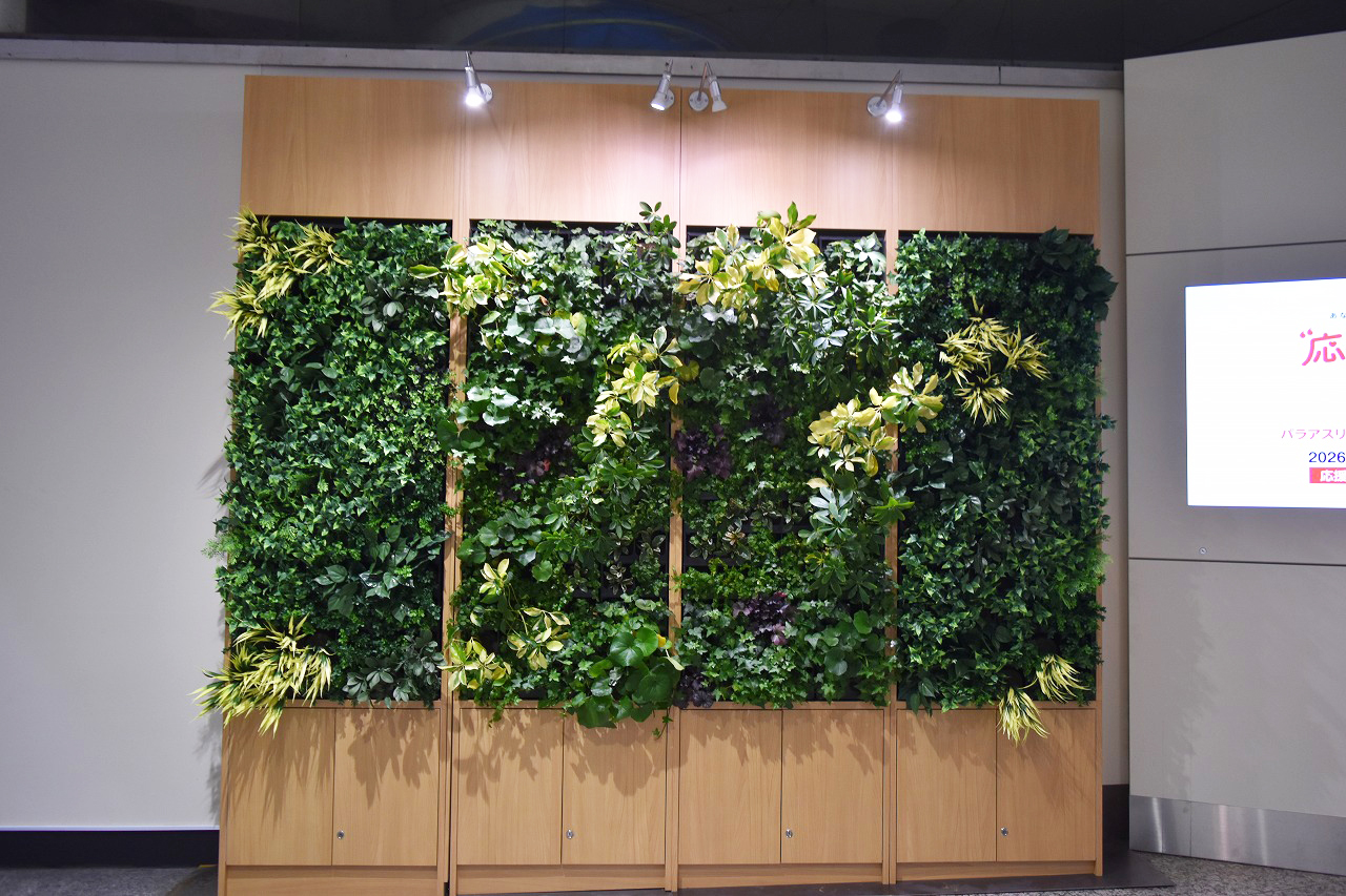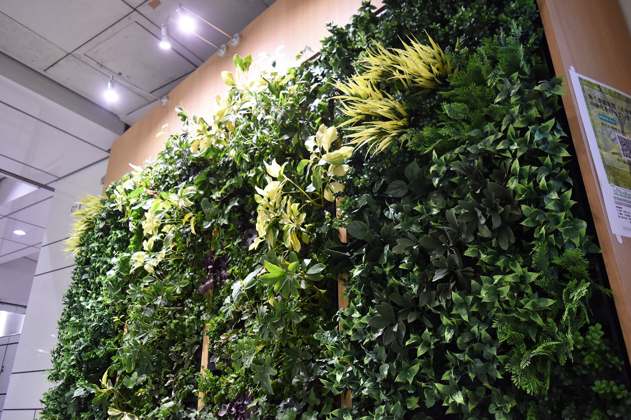 上の写真の壁面緑化パネルは、中央2枚のみが本物の植物になっています。こうした工夫を活用することで、これまで緑化が困難だった場所にも、緑のある空間を増やしていける可能性があります。本事例でも、そのための効果検証等が行われています。