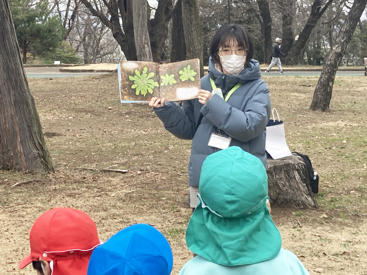 今回は「ふゆのぺたんこぐさ」という絵本を使って、「今の季節は草花たちが『ぺたんこぐさの形(ロゼット)』になっているよ」というお話をしました。