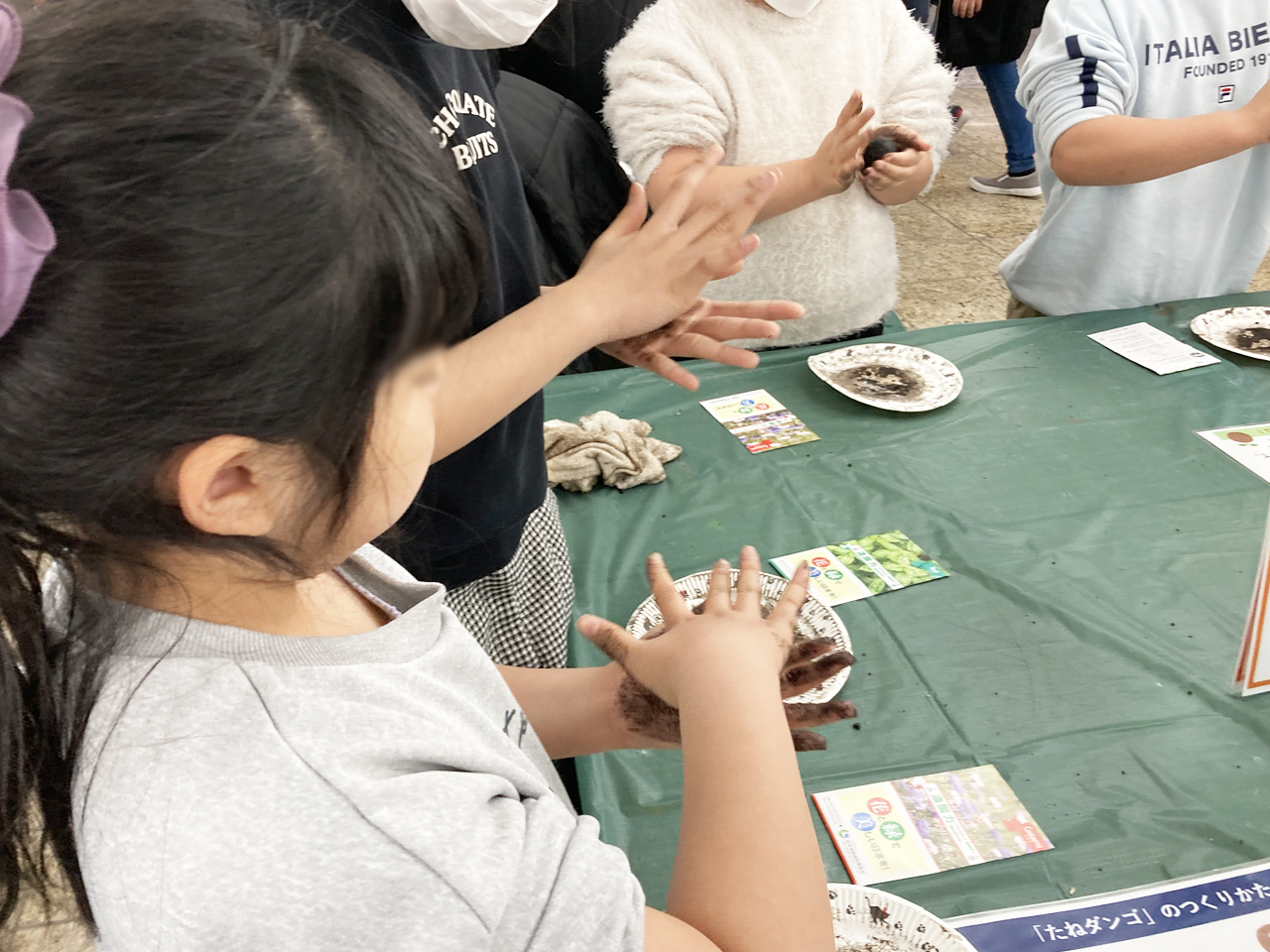 蜜源植物の種子をつかった「たねダンゴ」づくりのワークショップでは、ひんやりとした土の感触を楽しんだり、思ったよりも小さな種に驚いたり、未就学児~小学生高学年を中心に、多くのお子さまに体験を楽しんでいただきました。