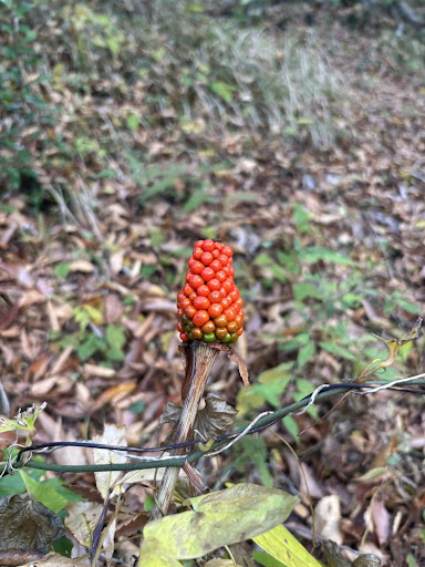 ウラシマソウかマムシグサのどちらかだと思いますが、それにしても見事な色。ただし、この仲間は強い毒を持っているので、見ても絶対に触ったり食べたりしないように注意が必要です。秋の自然の鮮やかな彩りを楽しませてもらいました。