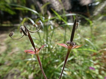 下の写真は、右はまだタネを飛ばしていないので、くるりとなっている先の丸い部分がまだ軸についているのがわかります。