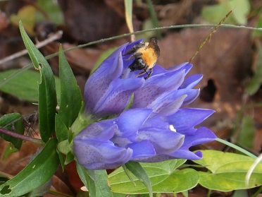 写真は、ハナバチがリンドウの花粉を集めにきたところ。