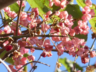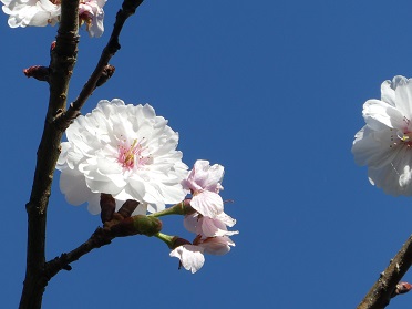 春に全力で花を咲かせるソメイヨシノ等のサクラに比べ、コブクザクラの秋の花数は少なめですが、それでも華やかな色どりを添えてくれます。