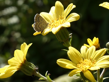 これから寒くなるにつれて、ますます花が少なくなりますが、そんな中でも長くきれいに咲いていくれるツワブキはチョウチョにとってもありがたい存在です。
