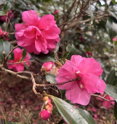 冬の澄んだ空気の中で、鮮やかなピンク色の花を咲かせる「サザンカ」。ツバキと似ていますが、花びらが一枚ずつひらひらと舞い落ちるのがサザンカの特徴です。寒さが厳しくなるこの時期、園内をパッと明るく彩ってくれるその姿には、見ているだけで元気がもらえるような凛とした美しさがあります。