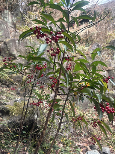 冬の園内で、パッと目を引く鮮やかな赤い実。これは「万両(マンリョウ)」という縁起の良い植物です。葉の下に隠れるように実をつけるのが特徴で、その控えめながらも華やかな姿は、寒さの厳しい季節に温かみを与えてくれます。お正月の縁起物としても親しまれる、日本の冬になくてはならない存在です。
