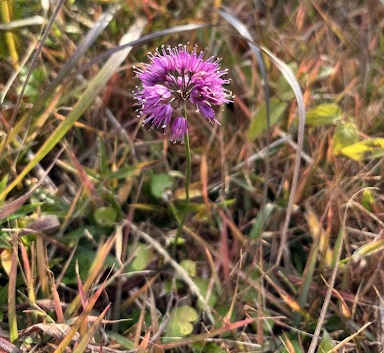 秋も深まるころ、ひっそりと咲いているヤマラッキョウです。細く伸びた茎の先に、タンポポの綿毛のような、可愛らしい球状の花をつけます。色は鮮やかな紅紫色。