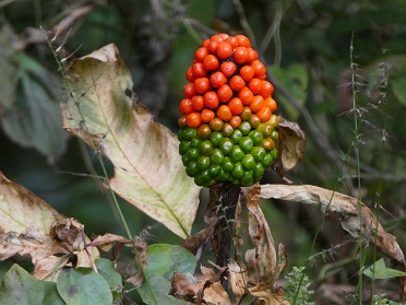 マムシグサの実は写真のようにオレンジから黄色、そして緑のグラデーションの色をしています。