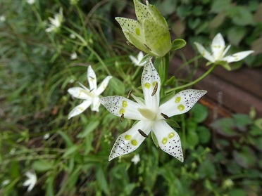 白くピンっと張った花びらに、緑色のドット模様がきれいです。