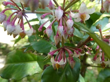 秋も押し迫るころ、真っ赤な実をつけるマンリョウが花を咲かせていました。