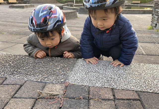 『自分の手よりも大きなカマキリを見つけて興味津々な兄弟。』