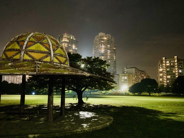 『夜の公園、雨に濡れた芝生が街灯の光を反射し鮮やかに輝いていました。』