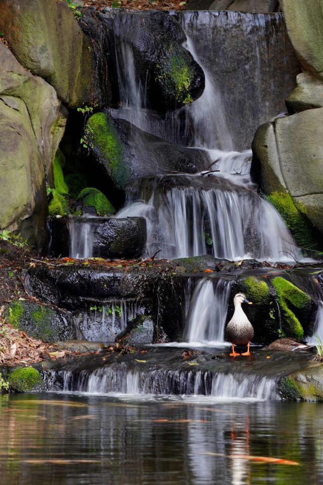 広い風景の中から滝と池をクローズアップし、点景として”Newマスコット”をポイントにした画作りはお見事です。