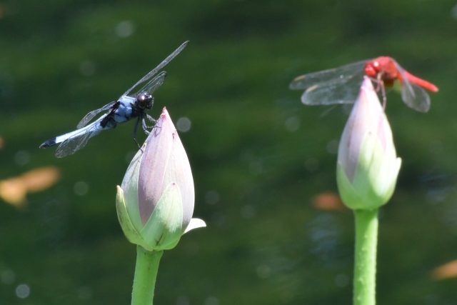 暗くシンプルな水面を背景にした画面のスッキリ度、ハスの距離感など、テクニックも上々です。左側のトンボの思いが痛いほどわかります。