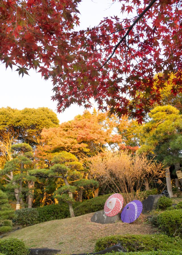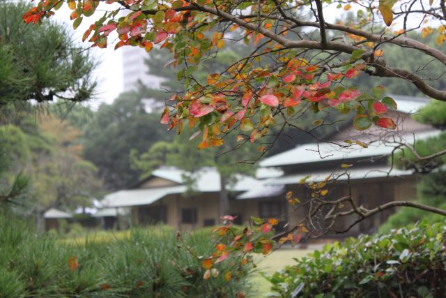 『見浜園の秋、黄金色を背景に緑の葉が輝き、金屏風の一部のようでした。』