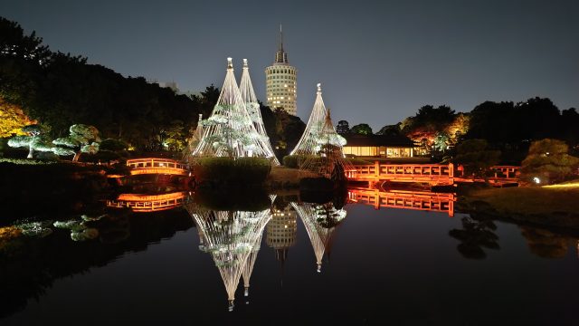 『見浜園。夜のライトアップが水面に鏡のように映り、美しい二つの世界の扉が開いた瞬間でした。』