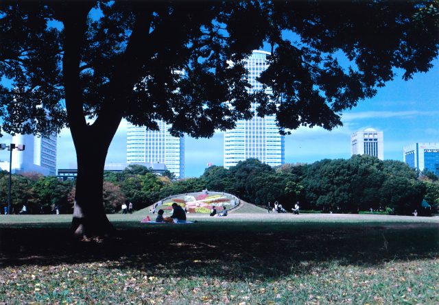 公園に立つ樹とその影で画面構成したダイナミックな構図がすばらしい作品です。カラフルな花時計を背景に親子・カップルが、都市の中のオアシスを楽しんでいるようす。いつまでもこんな平和な光景が続いてほしいと願わずにいられない1枚です。