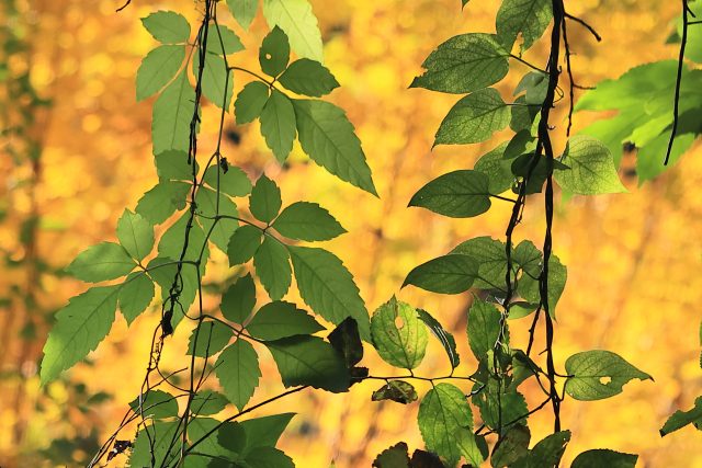 一部に陽が当たり、一部は木陰になった葉が変化を作ると共に、画面中央部に重なりのない葉を配置したことも好印象です。