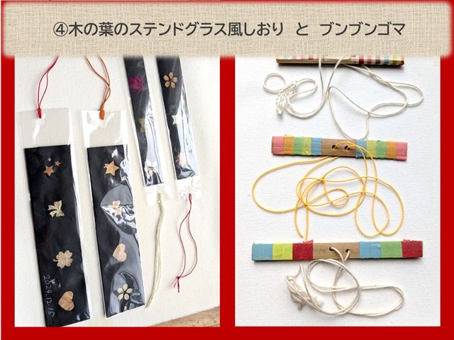 ④木の葉のステンドグラス風しおりとブンブンゴマ
