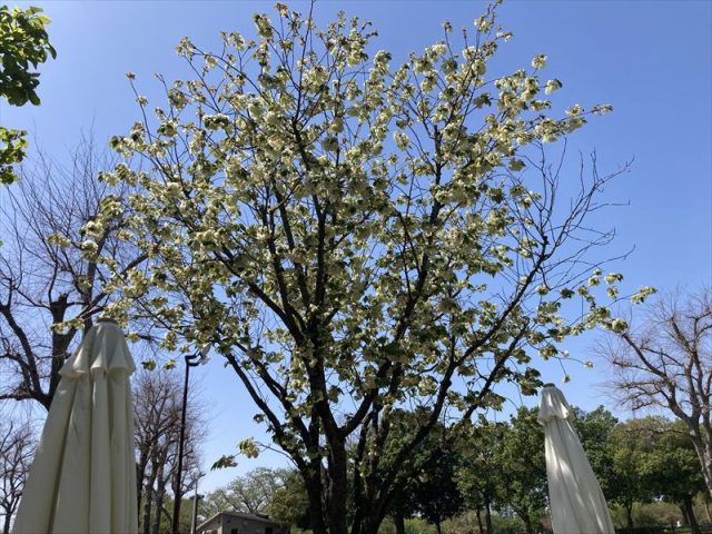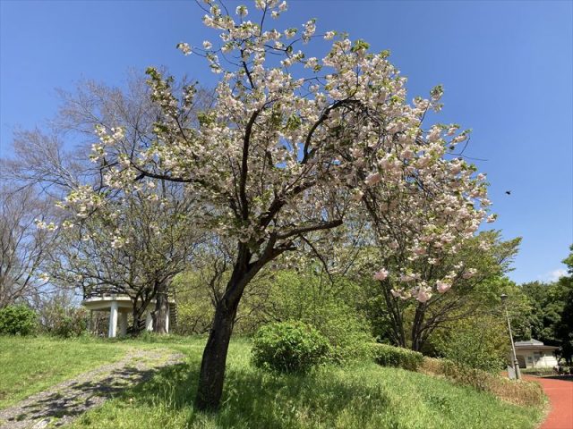 続いて、管理事務所前には、見頃をむかえた2種類の“サクラ”があります。