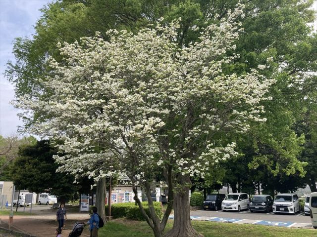 バッテリーカー場の近くには、白い花のハナミズキの木もありますよ。