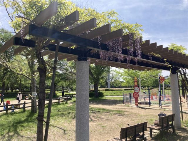 遊具広場(サンデンタルピアキッズベース)周辺のベンチがある2つの藤棚?では、フジの花が見頃をむかえています。