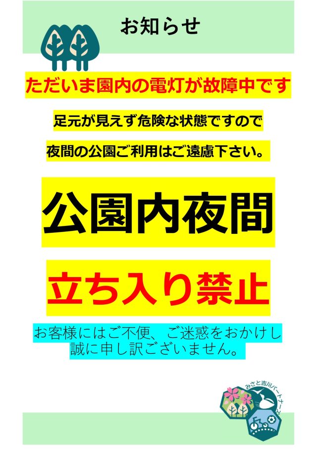 【みさと公園】公園内照明設備停電に伴う公園内夜間立ち入り禁止について