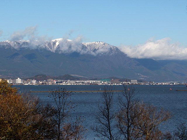 後ろには琵琶湖大橋と湖西の山々