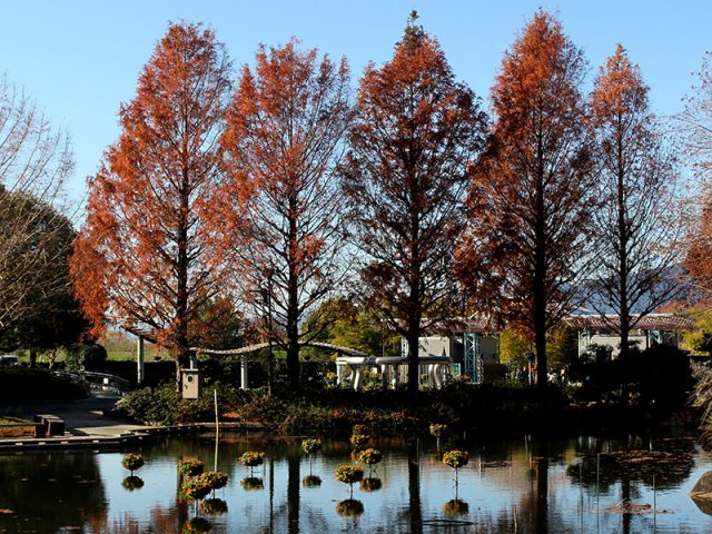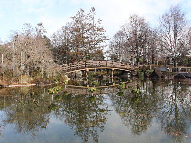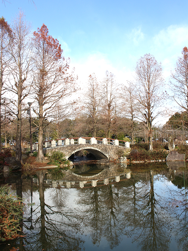 水面に木々と橋が映り込む「冬ならでは」の風景を撮ることができます。