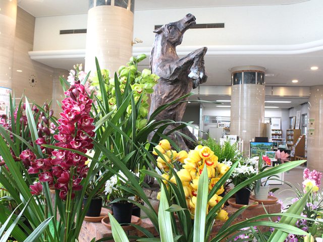 ロータス館のエントランスホールでは、午年にちなんで、洋ランと馬のチェンソーアートのコラボをご覧いただけます。記念撮影にもおすすめのスポットです。