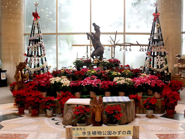 「干支とポインセチアの展示」が始まりました。来年の干支「午」をモチーフにしたチェンソーアートも必見です。