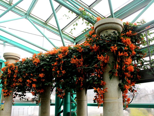 写真は「カエンカズラ」。あたたかいアトリウム(温室)で、ご覧いただけます。