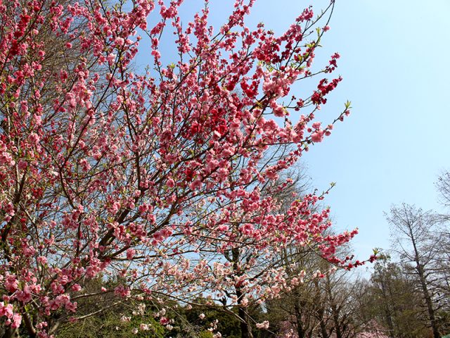 ハナモモも見頃です。花影の池の正面からは左奥に見ることができます。