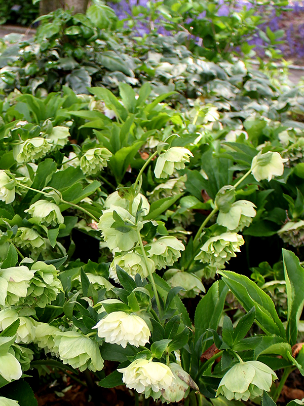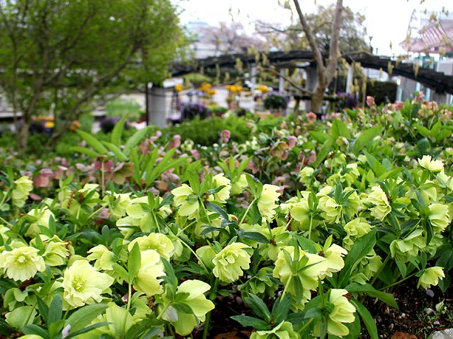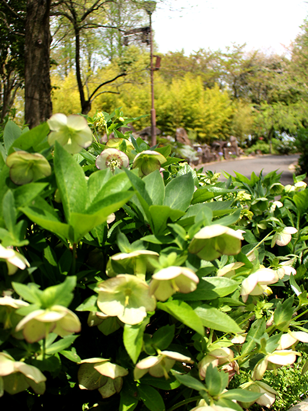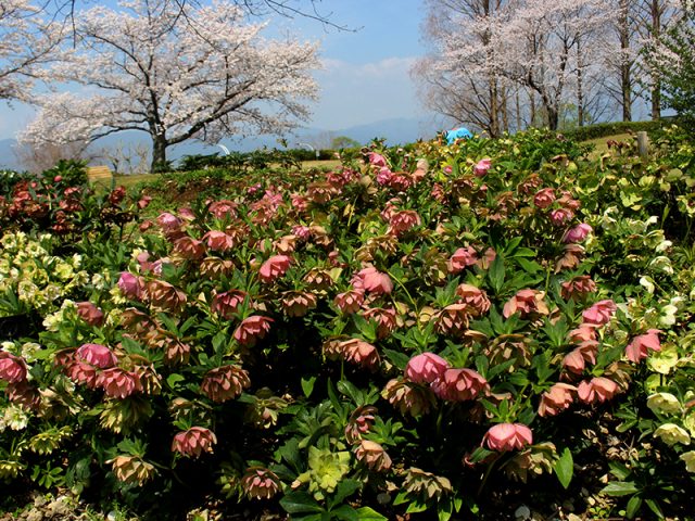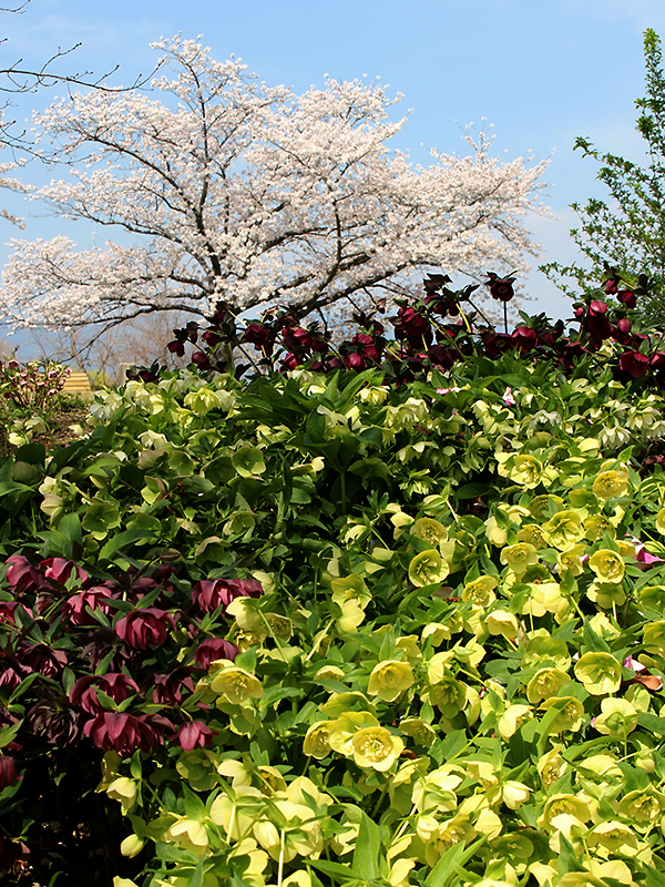 「君想ふ道」沿いから撮影。手前にクリスマスローズ、奥に「遊具広場」のソメイヨシノをご覧いただけます。