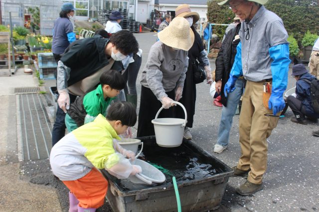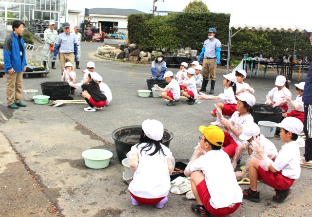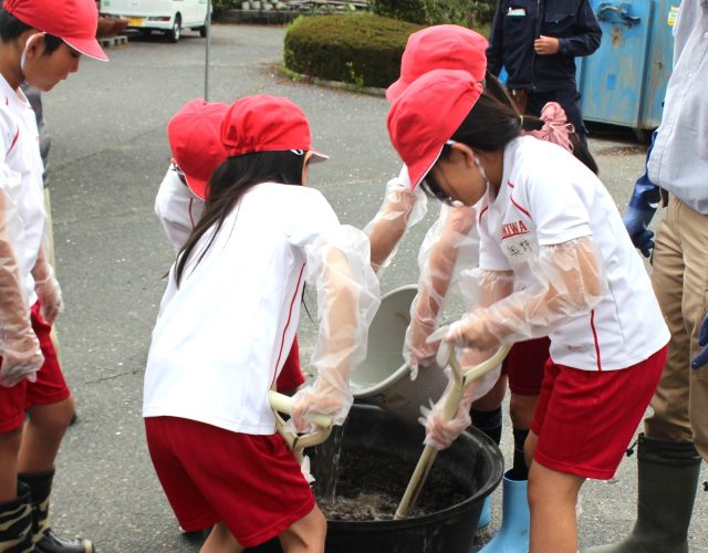 今日は、常盤小学校3年生の皆さんに参加していただき、大きい桶にレンコンを植え付けていただきました(^^)/