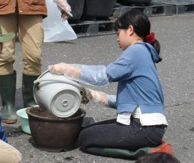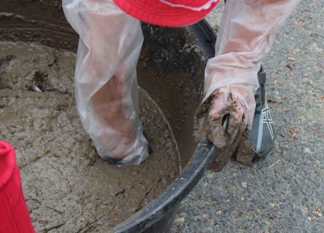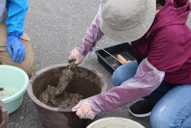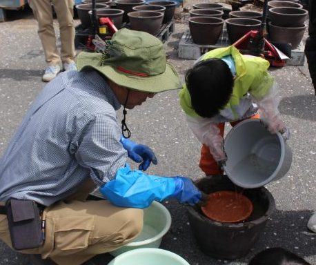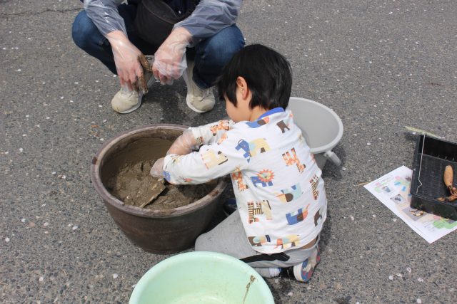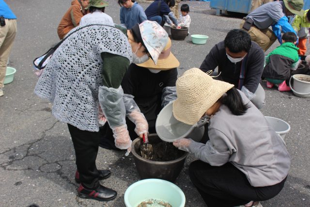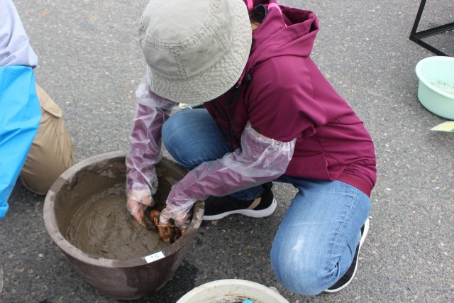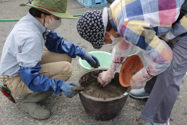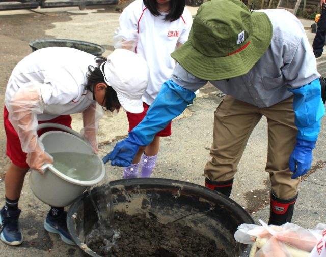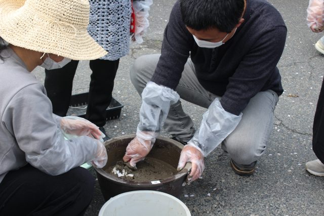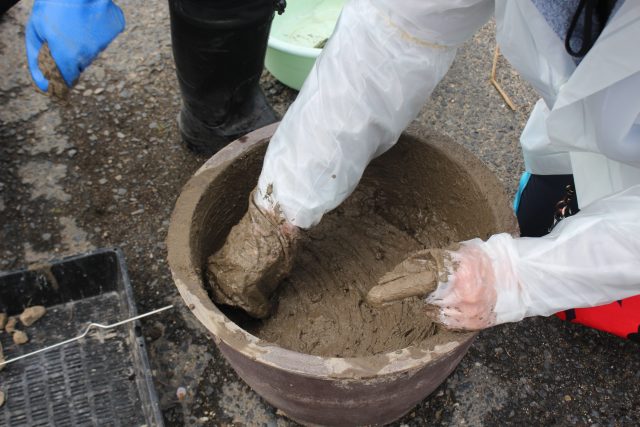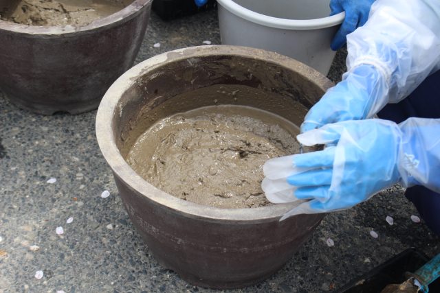まず、桶に水を入れて土をこねます。