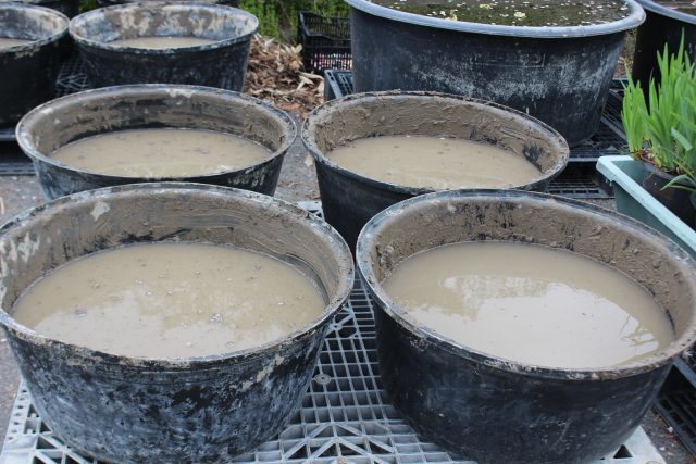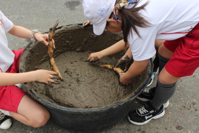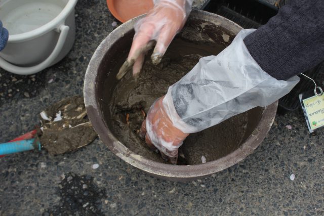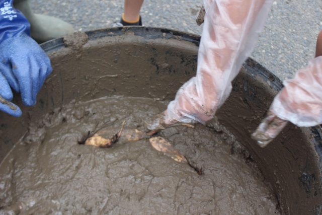 さらさらの土がなくなって、お味噌ぐらいの硬さになったら、レンコンの植えつけです。