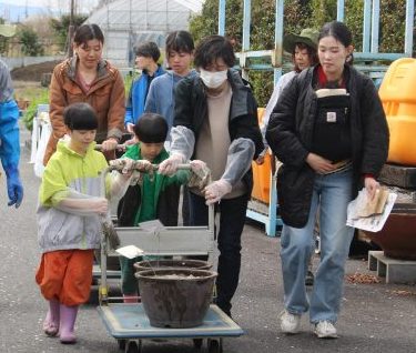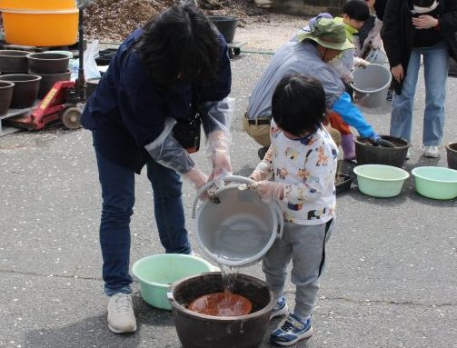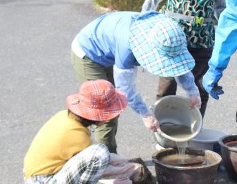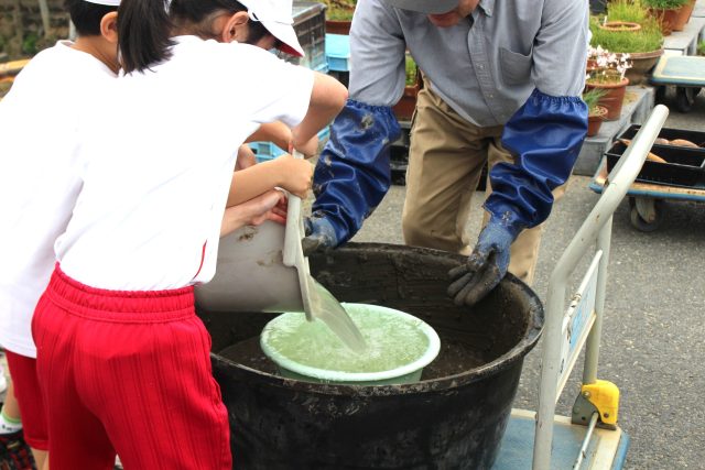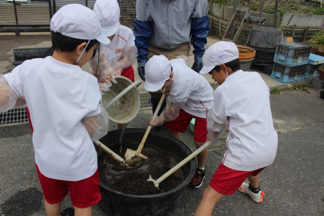 大きな桶の中には、田んぼの土と腐葉土、化成肥料、石灰が入っています。